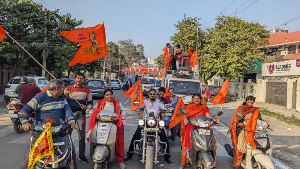 गाजियाबाद। समाज में जागरूकता लाने और समस्त हिन्दू समाज को एक मंच पर लाने के लिए राजनगर में आगामी 8 फरवरी को होने वाले हिन्दू सम्मेलन में शामिल होने के लिए सभी को संदेश देते हुए एक बाइक व कार रैली निकाली गई। यह रैली सरस्वती विद्या मंदिर राज नगर सेक्टर 9 से आरंभ होकर सेक्टर 13 व 14 से होती हुई, सेक्टर 14 के चौराहे से हिन्ट चौराहा होकर सेक्टर दो, पांच से निकलकर पुनः सेक्टर 10 के चौराहे से होती हुई, सेक्टर नौ के पश्चात सेन्ट्रल पार्क पर समाप्त हुई। इस रैली में महिलाओं तथा पुरुषों एवं युवाओं ने बढ़ चढ़कर भाग लिया। पूरे राजनगर को प्रभु राम की भगवा पताका तथा तोरणद्वार से सजाया गया था। इस रैली के दौरान सभी में बेहद उत्साह देखने को मिला। जगह जगह लोगों ने पुष्प वर्षा कर रैली का स्वागत किया । सकल हिंदू समाज ने इस रैली में सम्मिलित होकर अपनी हिंदू एकता का परिचय दिया।