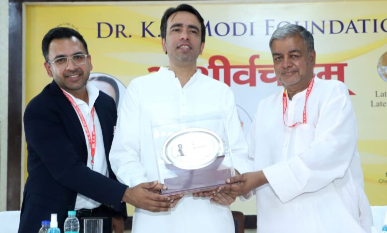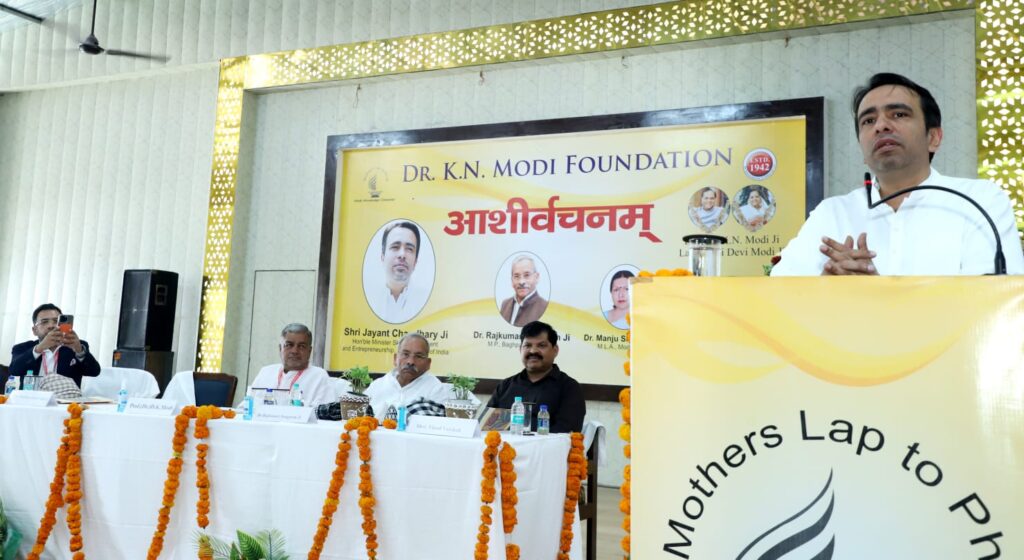 मोदीनगर। कार्यक्रम का आयोजनडॉ. के.एन. मोदी फाउंडेशन के तत्वावधान में आशीर्वादम में गुरुवार को भव्य समारोह हुआ। भारत सरकार के कौशल विकास एवं उद्यमिता मंत्रालय के मंत्री जयंत चौधरी मुख्य अतिथि रहे। बागपत लोकसभा सांसद डॉ. राजकुमार सांगवान, मोदीनगर विधायक डॉ. मंजू सिवाच और नगर पालिका अध्यक्ष विनोद वैशाली विशिष्ट अतिथि के रूप में उपस्थित हुए।शुभारंभ और संबोधनकार्यक्रम दीप प्रज्ज्वलन व सरस्वती वंदना से शुरू हुआ।